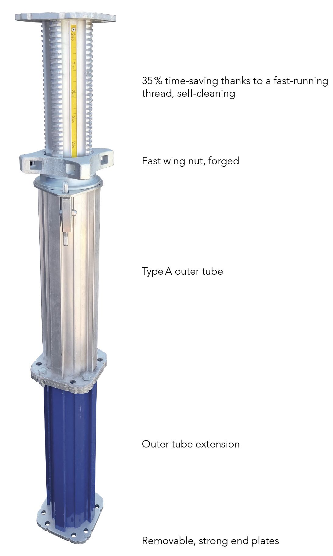 The core and distinctive feature of the Tobler Tower heavy-duty prop is the fast-running thread, which lets you work up to 35 % faster when turning the forged wing nut.