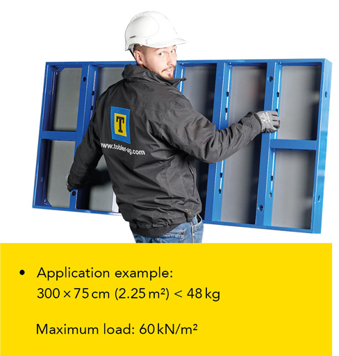 Tobler Manu is a standardised system that makes formwork significantly more cost-effective – regardless of layout or height. Where previously squared timber, boards, nails, or even a crane were required, the practical Tobler Manu modular system makes you faster and much more flexible.