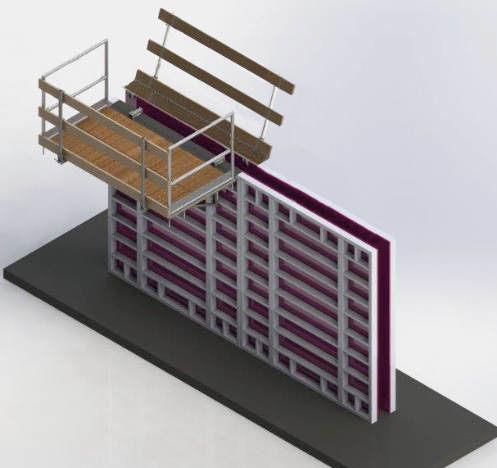 A major benefit of the Tobler TOP concreting platform is that it is set up on the wall formwork from above, secures itself, and is then supported high up on the wall formwork by means of folding scaffolding brackets.