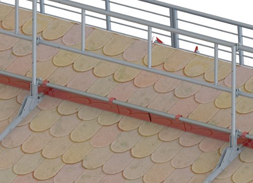 Building on the Tobler rafter clamps, guardrail standards with half-couplings are used to attach the upper and lower scaffolding tubes to the gable guardrail. The guard rail standards are secured in place using pins or screws.