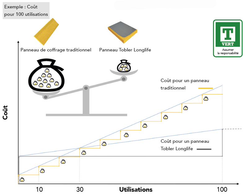 Le nouveau panneau Tobler Longlife vous permet de réaliser jusqu’à 100 opérations de bétonnage tout en garantissant un aspect parfait du béton. Il suffit de 30 utilisations pour que l’investissement soit rentable. Cela vaut aussi bien pour vous que pour l’environnement.