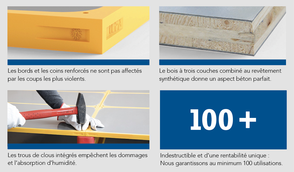 Les panneaux Long Life Panel peuvent être utilisés plus de 100 fois sans altérer l’aspect de la surface du béton et sont parfaits pour le béton apparent.