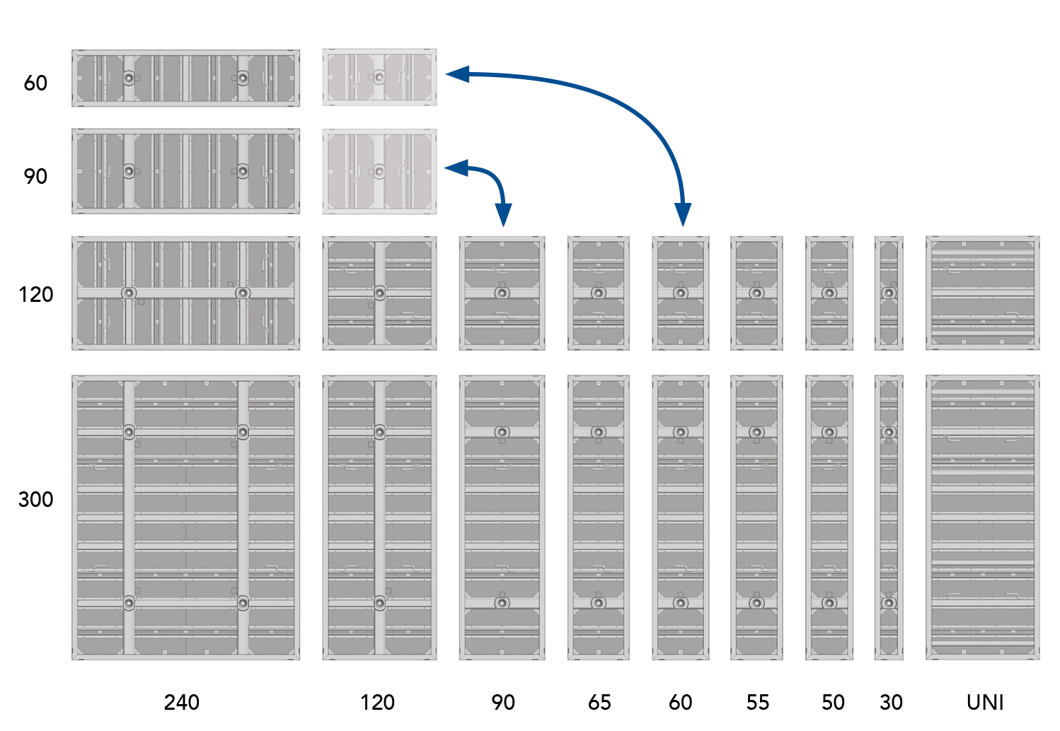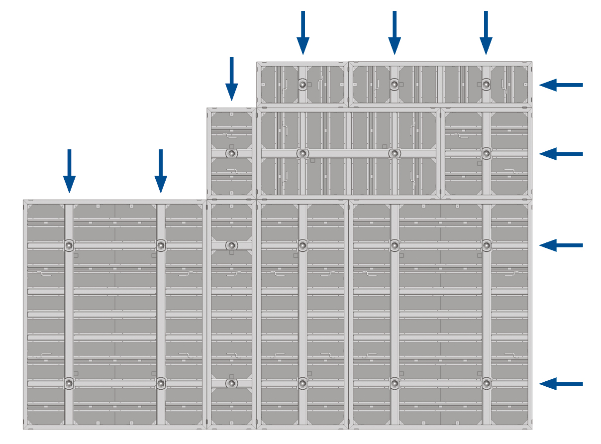 Les éléments de coffrage sont symétriques et peuvent être combinés entre eux au choix. Grâce à la hauteur d’élément de 300 cm, de nombreux projets de construction peuvent être coffrés avec seulement deux positions d’ancrage sans réhausse. Toutes les tâches de coffrage peuvent être réalisées avec seulement 20 types d’éléments différents.