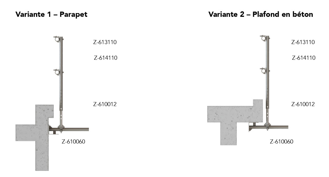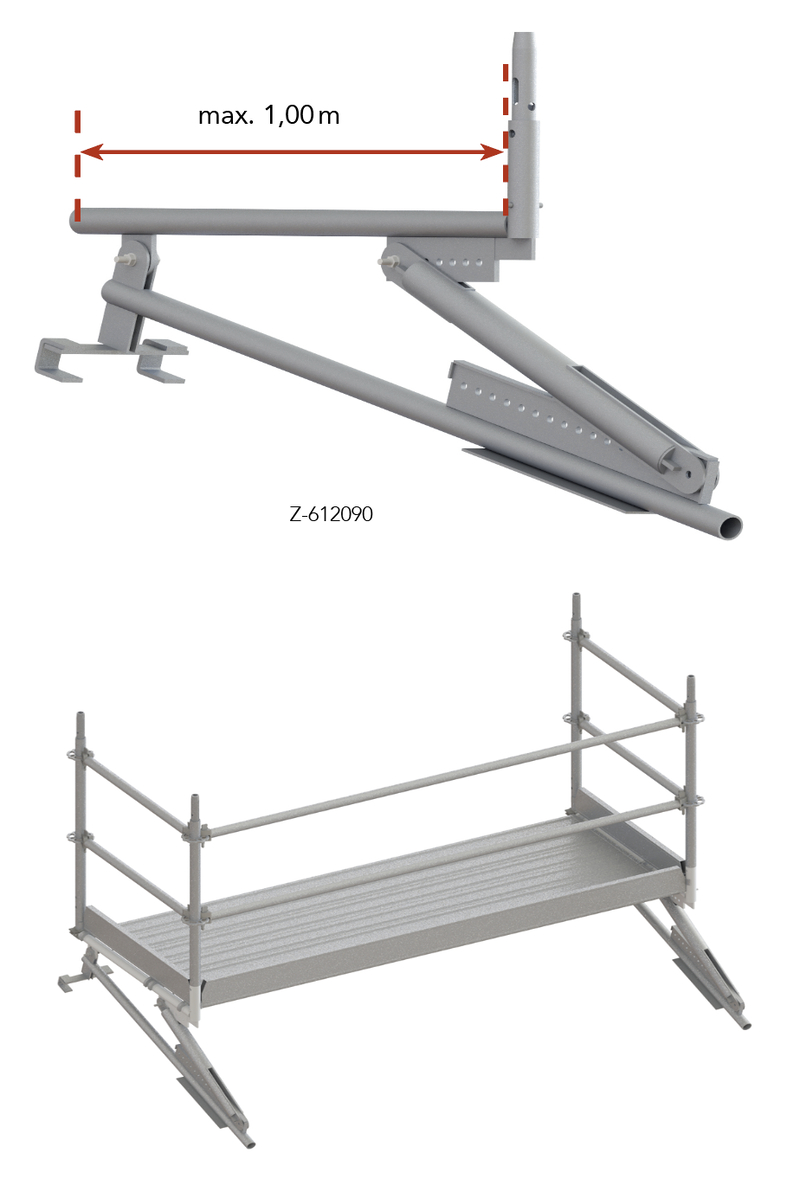 Les consoles sont montées à une distance de 2 à 3,20 m, selon la maçonnerie. Seuls des tubes d’échafaudage de Ø 48,3 mm ou des éléments porteurs en aluminium peuvent être utilisés comme garde-corps.