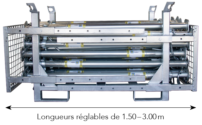 Le châssis fermé spécial en haute qualité Tobler peut être ajusté dans toutes les longueurs. Grâce à la protection intégrée contre les chutes, une sécurité absolue est garantie pendant le transport et la manutention sur le chantier.