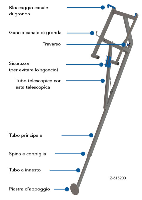 Per il fissaggio la mensola integrale viene agganciata semplicemente al canale di gronda o al bordo del tetto. Le forze vengono distribuite tramite appositi montanti sulla facciata. Per ulteriori informazioni fare riferimento alle istruzioni dettagliate per il montaggio.